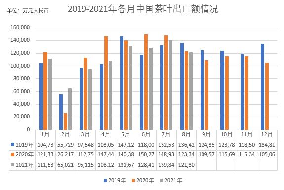 2021年8月,全國茶葉出口29,655噸,相比去年同期的28,406噸,上漲4.4%,出口金額為121,306萬元,相比去年同期的123,349萬元,下降1.6%(以美元計上漲6.9%),均價40,906元/噸,相比去年同期的43,424元/噸,同比下降5.8%。較疫情前的2019年同期(出口量35,706噸,出口額136,420萬元,均價38,206元/噸)來看,出口量差距較大,僅為2019年同期出口量的83%左右,但出口均價有所上漲。 2021年1-8月,全國茶葉累計出口量為223,814噸,相比去年同期的233,952噸,下降4.3%。出口額為901,073萬元,相比去年同期的970,698萬元,下降7.2%(以美元計上漲0.9%)。出口均價40,260元/噸,相比去年同期的41,491元/噸,同比下跌3.0%。較疫情前的2019年同期(出口量245,445噸,出口額895,157萬元,均價36,471元/噸)來看,今年1-8累計出口量僅為2019年同期的91.2%,但出口金額以微小幅度增加,出口均價上漲了10.4個百分點。 從各月數據來看,除2月出口量和出口金額大幅上漲,其余7個月份出口量或出口金額均有不同程度下降,但整體降幅逐漸呈縮小走勢,直至8月,出口量小幅超過去年同期水平,出口金額同比也達到1-8月之間最小降幅。7月和8月開始有逆轉趨勢,與上年差距明顯縮小。從美元看,7月茶葉出口金額上漲3.6%,1-7月累計出口金額已追平去年同期,8月茶葉出口金額上漲6.9%,1-8月累計出口金額以微小幅度超去年同期,但因今年美元兌人民幣匯率下降,人民幣升值,導致從人民幣看出口金額仍略低于去年同期。全國茶葉全年出口量是否會出現自2014年來的二連降須看最后四個月能否保持逆勢而上,若要達到去年水平,剩下4個月出口總量需達到125,000噸,平均每月31,250噸。而根據去年9-12月,4個月的出口總量約為114,863噸,如今年年底無重大變化,預計今年全年茶葉出口總量將在34萬噸上下。 (茶葉預警點領導小組辦公室) |