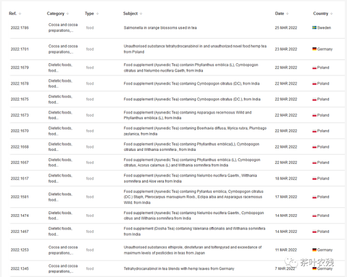 1.通報日期:2022年1月6日 通報國家:歐盟 通報信息:來自印度的茶葉檢出啶蟲脒和久效磷(沒有通報具體數據) 處理結果:暫未做決定 備注:啶蟲脒歐標0.05mg/kg;久效磷歐標0.05mg/kg 2.通報日期:2022年1月10日 通報國家:德國 通報信息:來自阿根廷,經由荷蘭的馬黛茶檢出蒽醌(沒有通報具體數據) 處理結果:警告 備注:馬黛茶,全名耶巴馬黛茶來自于西班牙語YERBA MATE的譯音,是冬青科大葉多年生木本植物 3.通報日期:2022年1月14日 通報國家:波蘭 通報信息:來自中國的茶葉檢出啶蟲脒(0.19+/-,1mg/kg 蒽醌(0.15+/-0,08mg/kg),三氟氯氰菊酯(0.024+/-0,012mg/kg),二硝基呋喃即呋蟲胺(0.057+/-0,029mg/kg),吡蟲啉(0.12+/-0,06mg/kg) 處理結果:海關拒收 備注:啶蟲脒歐標0.05mg/kg;蒽醌歐標0.02mg/kg,三氟氯氰菊酯歐標0.01mg/kg,二硝基呋喃即呋蟲胺歐標0.01mg/kg,吡蟲啉歐標0.05mg/kg 4.通報日期:2022年2月10日 通報國家:芬蘭 通報信息:來自中國,經由德國的茶葉檢蒽醌(沒有通報具體數據) 處理結果:警告 5.通報日期:2022年3月 通報國家:德國、波蘭等 通報信息:15項,多是混雜未經歐盟許可的植物、植提物或微生物,不做具體翻譯,具體如下圖: 來源:茶葉農殘公眾號 |