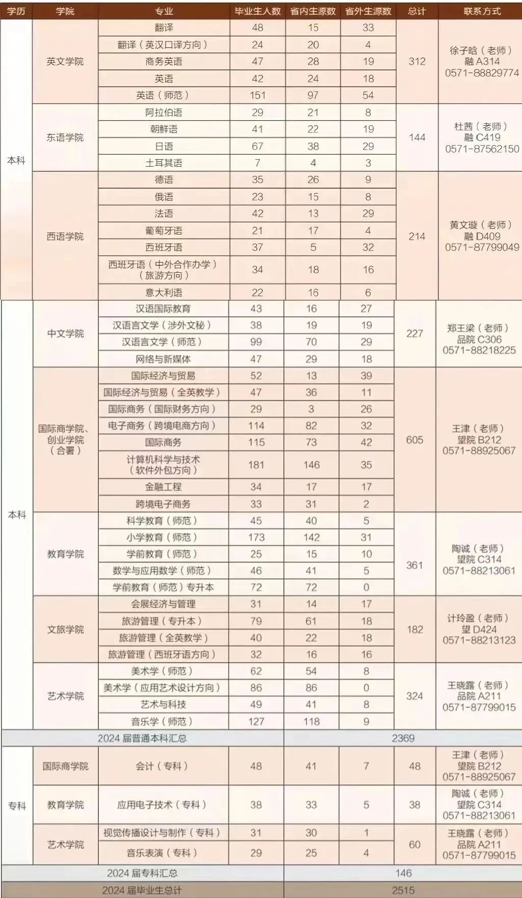 又是一年就業季 浙江外國語學院2024屆畢業生們 即將乘風逐夢啟征程 優秀上進的他們 帶著豐厚碩果來啦 特此邀您一起見證他們的魅力 學校簡介 浙江外國語學院(Zhejiang International Studies University,縮寫為ZISU,簡稱“浙外”。)是一所以外國語言文學學科為基礎,文學、經濟學、教育學、管理學、法學、藝術學、理學等學科協調發展的公立省屬普通本科高校。學校前身為創建于1955年的浙江教育學院,1994年開始普通本科教育,2010年經國家教育部批準改制并更名?!懊鞯潞胍?博雅通達”為學校校訓。 人才培養 學校堅持“立德樹人”根本任務,積極構建符合人才成長規律、體現時代要求、彰顯浙外特色的人才培養體系,努力培養一批德智體美勞全面發展的具有家國情懷國際視野,熟悉中國國情、知曉國際規則、熟練運用外語、精通具體領域的高素質應用型人才。 01 優化專業結構與布局 深化專業內涵建設 學?,F有35個本科專業,其中外語類專業15個,涉及外語語種13種,涵蓋聯合國官方語言、“一帶一路”沿線國家的主要語言、浙江對外交流的關鍵語種。學校主動對接“一帶一路”建設和浙江開放強省建設需求,努力建設具有區域競爭優勢的四大類專業群。 學校擁有英語、小學教育、阿拉伯語、翻譯、旅游管理、商務英語、俄語等7個國家級一流專業,國家級一流本科專業建設點數量在新建本科院校中名列前茅。 02 創新人才培養模式 培養高素質涉外人才 學校以“外語+” “+外語” 和雙校園、創新實驗班等為抓手,通過“3+1” “2+2” “4+0” “10學分拓展模塊”等一攬子人才培養創新模式,創新“‘三四制’高素質涉外人才培養”模式,培養了一大批活躍于語言服務、跨境電子商務、涉外法治、 商貿旅游、文化交流等行業領域的高素質涉外人才。近年來,畢業生紛紛考取北京大學、浙江大學、復旦大學、倫敦大學學院、愛丁堡大學、墨爾本大學等知名高校。 03 推進中外合作辦學 培養國際化復合型人才 西班牙語(旅游方向)中外合作辦學專業和意大利語中外合作辦學專業是目前國內首個該語種合作辦學項目。在赤道幾內亞、安提瓜和巴布達建有兩所孔子學院。 學校獲批建設教育部“高層次國際化人才培養創新實踐基地”,擁有“國際志愿服務實踐育人平臺”,師生國際志愿服務成為助力浙江城市國際化的金名片。 04 國際化就業形態豐富多樣 高質量就業持續向好 學生競賽碩果累累,獲“外研社杯”全國英語演講大賽國家特等獎、“挑戰杯”全國大學生課外學術科技作品競賽國家一等獎等A類學科競賽高級別獎項。學校人才培養特色和質量獲得社會認可,就業質量逐年提升,近年來應屆本科畢業生平均就業率保持在較高水平。從事國際經貿往來、國際教育合作、國際文化交流的畢業生逐年增多。有數名畢業生入職聯合國辦公室、國際組織等相關單位。在校生也積極參與國際組織事務工作,多名在校生收到了國際交流研究院(1E)、歐洲文化研究所(ICAEP)、歐亞文化研究所(IEAC)實習offer。 05 敲黑板來啦! 2024屆畢業生將閃亮登場 2024年,我校即將畢業的學生有2515人,其中本科生2369人,??粕?46人。 基本情況表: 浙外用優質多樣的平臺 打造出具有家國情懷、國際視野的棟梁之才 浙外學子勤勉努力,奮發自強 如果能有機會成為貴企業中的一員 定能貢獻獨特的青年智慧與力量 以他們扎實的專業知識和能力 讓用人單位無愧于他們的選擇! 招聘方式 校園招聘將以線上 與線下結合的方式開展 聯系我們 學校創業與就業指導服務中心 聯系人:楊洋 胡珺 電話:0571-88213059 郵箱:jiuye@zisu.edu.cn 地址:浙江省杭州市西湖區留和路299號 (310012) 明德弘毅 博雅通達 巍巍學府 人才輩出 愿各用人單位在我校攬“才” 預祝畢業生們都能被心儀的用人單位錄取 逐夢啟程,“職”為你來! END 來源:浙江貿促綜合整理自浙外就業創業服務 |