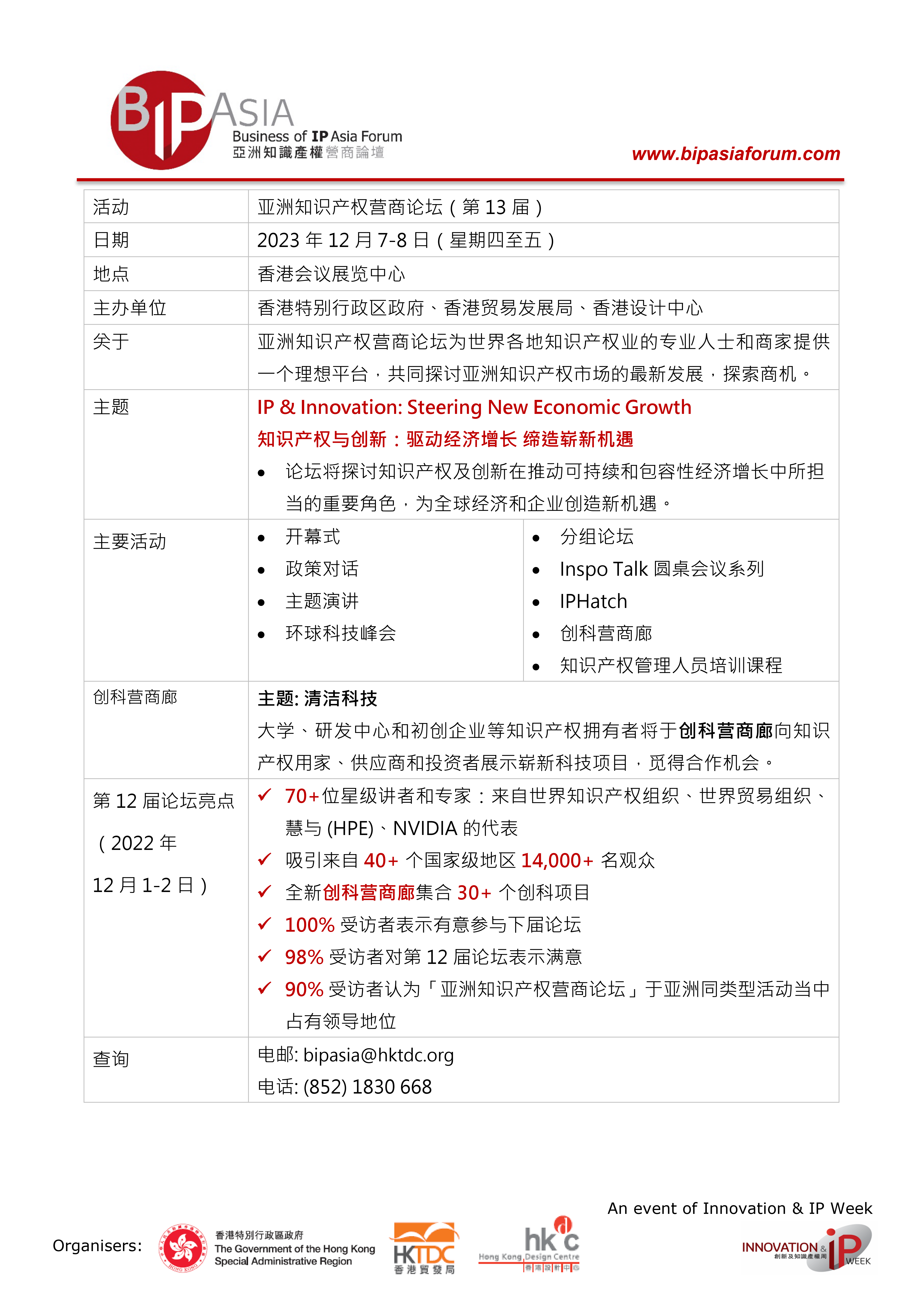 第十三屆“亞洲知識產權營商論壇”誠邀您赴港參加 |