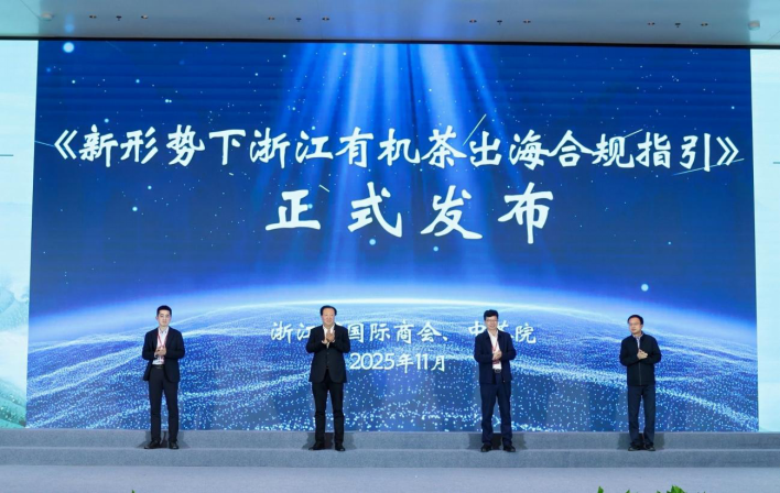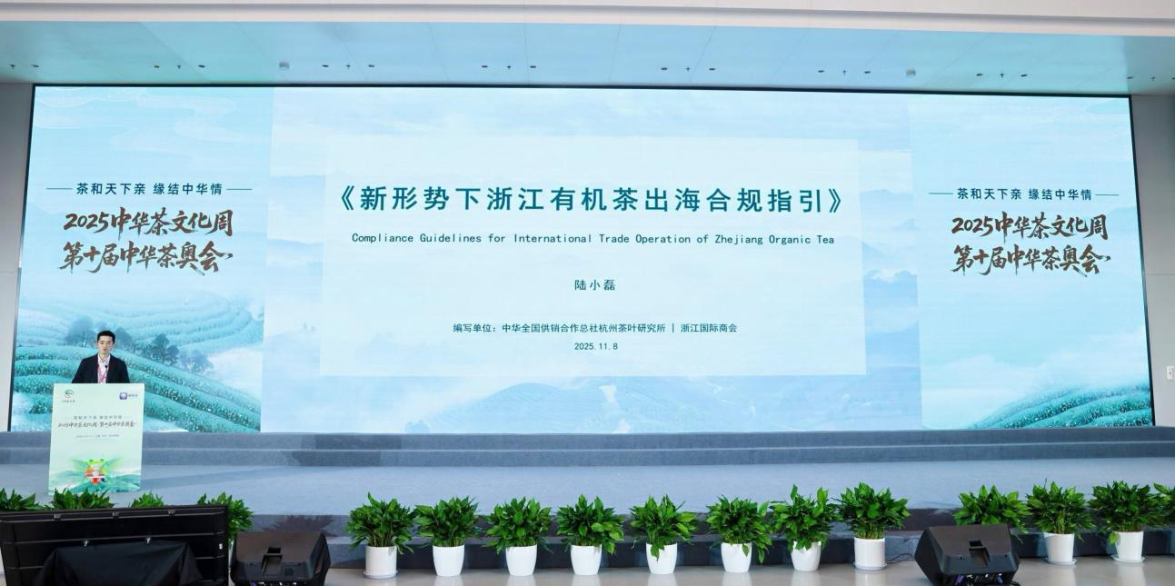(研討會全景) 研討會聚焦行業熱點,設置了圓桌對話、主題分享及專題培訓等多元環節。活動中,農業農村部原總農藝師、中國國際茶文化研究會副會長廣德福,中國國際茶文化研究會副會長、浙江大學茶葉研究所所長王岳飛,浙江省貿促會、省國際商會秘書長潘建松,中華全國供銷合作總社杭州茶葉研究所黨委副書記、國家茶葉質量檢驗檢測中心主任陸小磊共同為由浙江省國際商會牽頭編制的《新形勢下浙江有機茶出海合規指引》舉行了現場發布儀式。