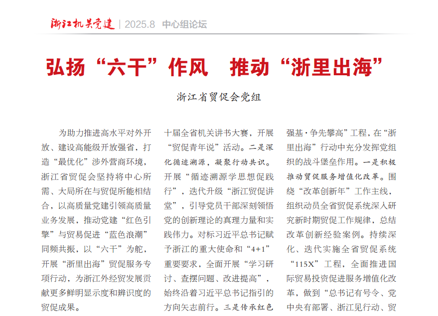 為助力推進高水平對外開放、建設高能級開放強省,浙江省貿促會堅持推動黨建“紅色引擎”與貿易促進“藍色浪潮”同頻共振,開展“浙里出海”貿促服務專項行動,為浙江外經貿發展貢獻具有鮮明顯示度和辨識度的貿促成果。2025年8月,《浙江機關黨建》總第218期刊發了浙江省貿促會黨組的文章——《弘揚“六干”作風 推動“浙里出海”》,從四個方面系統闡述了浙江省貿促會如何以高質量黨建引領高質量業務發展,推動“浙里出海”貿促服務專項行動有效落實。 01 堅持凝心鑄魂 厚植“浙里出海”信仰之基 堅持不懈用習近平新時代中國特色社會主義思想凝心鑄魂,堅定擁護“兩個確立”,堅決做到“兩個維護”,為“浙里出海”行動提供強大的精神動力。一是強化理論武裝,筑牢思想根基。堅持把學習貫徹習近平新時代中國特色社會主義思想作為終身課題,以黨組理論學習中心組學習為牽引,完善“四學一體”機制,落實“貿促八學法”,實施青年理論武裝提升工程,積極參與“青年政策面對面”宣講、第十屆全省機關講書大賽,開展“貿促青年說”活動。二是深化循跡溯源,凝聚行動共識。開展“循跡溯源學思想促踐行”,迭代升級“浙江貿促講堂”,引導黨員干部深刻領悟黨的創新理論的真理力量和實踐偉力。對標習近平總書記賦予浙江的重大使命和“4+1”重要要求,全面開展“學習研討、查擺問題、改進提高”,始終沿著習近平總書記指引的方向矢志前行。三是傳承紅色基因,鍛造過硬隊伍。開展“紅船精神 20 周年”主題活動,組織全省貿促系統黨員干部代表赴浙江紅船學院舉辦專題讀書班,深化學習習近平總書記“三賀信一批示”精神,加強對黨忠誠教育、理想信仰教育、正確政績觀教育等,引領黨員干部增強政治意識,提高政治站位。樹牢“六干”導向,激勵干部敢于擔當、積極作為,鍛造新時代“貿促鐵軍”。 省貿促會在浙江紅船干部學院舉辦“弘揚紅船精神、強化黨性修養”集中讀書班 02 聚焦中心大局 推動“浙里出海”改革創新 錨定浙江外經貿高質量發展核心目標,縱深推進“固本強基·爭先攀高”工程,在“浙里出海”行動中充分發揮黨組織的戰斗堡壘作用。一是積極推動貿促服務增值化改革。圍繞“改革創新年”工作主線,組織動員全省貿促系統深入研究新時期貿促工作規律,總結改革創新經驗案例。持續深化、迭代實施全省貿促系統“115X”工程,全面推進國際貿易投資促進服務增值化改革,做到“總書記有號令、黨中央有部署、浙江見行動、貿促扛擔當”。二是創新實施貿促共富五大行動。對標對表省委“132”總體部署,以“爭當共同富裕示范區建設探路者”的政治自覺,將“浙里出海”專項服務全方位融入共富目標,創新實施“幫扶帶富、開放促富、貿易興富、服務助富、法助共富”5大行動14條舉措,實現優勢互補、互融共促。三是聚力打造貿促服務品牌新標桿。深入貫徹落實推動外經貿高質量發展座談會精神,落實落細“優強貿促服務推動外經貿高質量發展”十項舉措,凝心聚力實施“浙里出海”貿促服務專項行動,打造浙江貿促服務浙企浙商綜合品牌。深入開展“1+4”系列服務,做好助企惠企綜合服務,為企業“出海”建言獻策、牽線搭橋;舉辦“1+N”跨境電商專場系列活動,推進“跨境電商+ 產業集群”發展;舉辦國別貿易投資促進系列活動,促成貿易與投資項目落地。建立健全“浙里出海”服務聯盟,為企業“走出去”發展、屬地化布局等提供專業服務。 3月6日,2025“浙里出海”—“1+N”跨境電商助企行動正式啟動 03 強化擔當作為 賦能“浙里出海”提質增效 聚焦企業需求,大力弘揚“六干”作風,賦能“浙里出海”在質量與成效上實現雙突破。一是推動服務網絡擴面提質。加強基層貿促機構工作規范化、專職化、專業化建設,分片區開展干部綜合業務培訓會。大力加強海外“兩張網”建設,形成全省海外資源共享共建機制。完善海外聯絡處工作運行和管理機制,探索開展海外顧問聘任工作,強化與境外友好商協會的交流合作,建立健全與駐華使領館和外國在華商協會的常態化溝通聯系機制,搭建高質量政企對話平臺。二是聚焦需求提升服務效能。采用政企對接、組展參展、經貿洽談、走訪調研、系統培訓等方式,提供“點菜式”“互動式”“下沉式”的深度服務。扎實開展“走進矛盾、破解難題、擔當有我”活動,組織黨員干部深入企業、產業園區等,開展全面深入的調查研究,會同專家提出解決方案,協調相關部門共同解決問題,為黨委、政府決策建言獻策,以務實舉措助推開放型經濟發展。三是大力推進機關效能建設。實施黨組織書記領辦機關效能項目制度,落實加強機關效能建設“十二條”,推動機關建設實現新的提升。加強項目績效評價,對績效明顯的項目進行宣傳推廣,彰顯貿促系統“高效辦成一件事”“我為基層辦實事”。如4月舉辦關稅背景下原產地合規與FTA拓市場培訓,為企業利用原產地規則、突破關稅壁壘、合規穩健出海提供解決方案,受到企業的廣泛好評。 3月27日,省貿促會會長陳建忠在金華調研 04 建設清廉貿促 夯實“浙里出海”作風保障 貫徹落實習近平總書記關于加強黨的作風建設的重要論述精神,大力建設清廉貿促,護航“浙里出海”行穩致遠。一是扎實開展深入貫徹中央八項規定精神